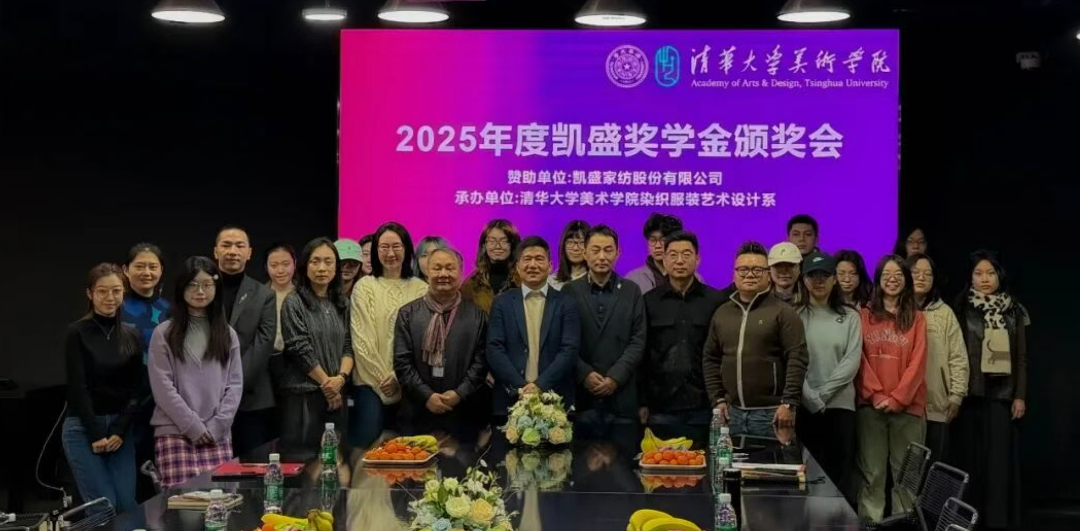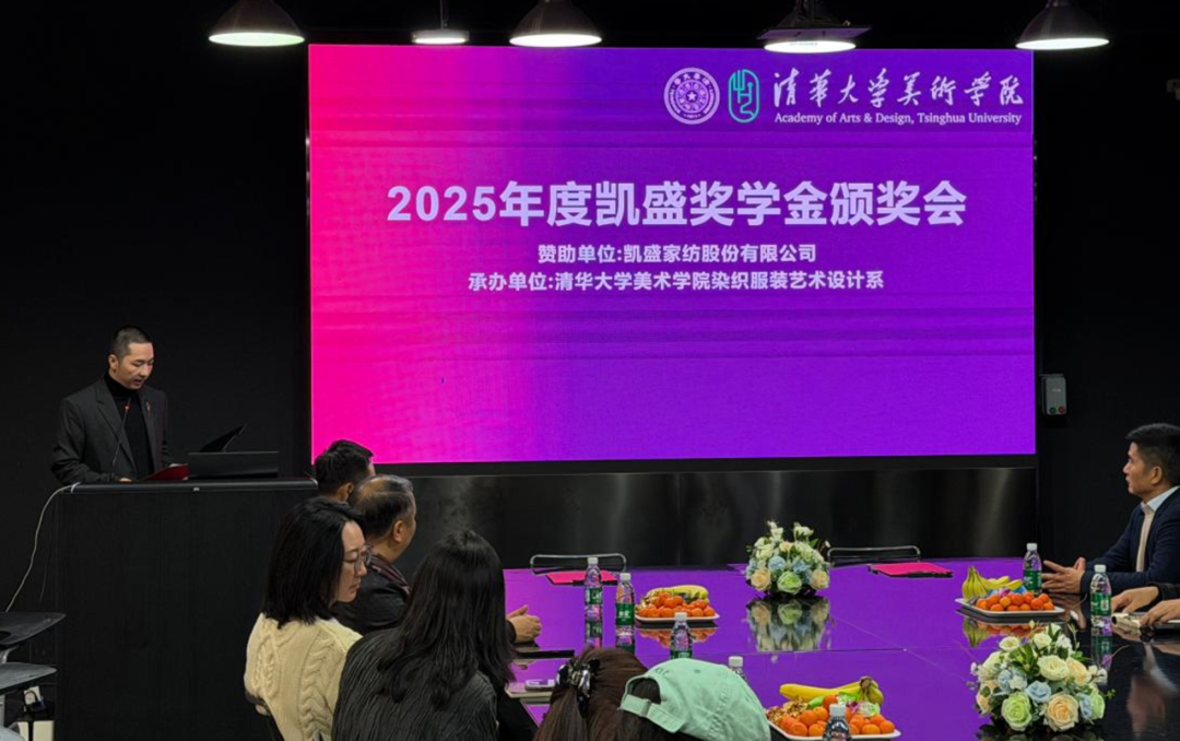 2026年1月9日,清华大学美术学院染织服装艺术设计系师生齐聚一堂,举行2025年度“凯盛奖学金”颁奖会。凯盛家纺股份有限公司创始人秦瑞岗、研发总监姜帅、营运中心总监王丁等企业代表,清华美院副院长李迎军,染织服装艺术设计系主任张宝华、党支部书记王悦等学院老师,以及30余名染织服装艺术设计系研究生与本科生共同参与,见证校企融合新篇章。
